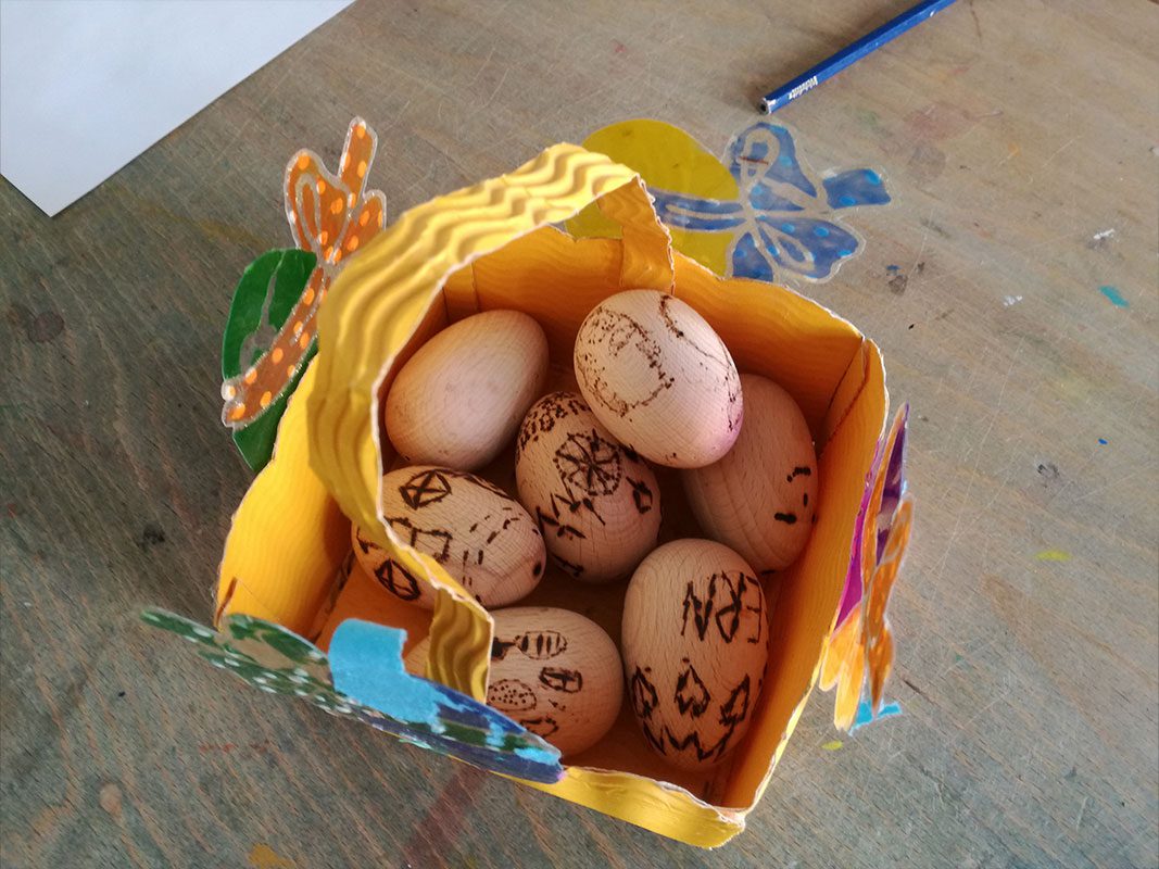Wir haben am Lötkolben Eier verziert. Es sah einfach aus, war aber gar nicht so einfach, weil man mit einem Lötkolben nicht so gut malen kann, wie mit einem Stift und das Ei ja auch oval war.